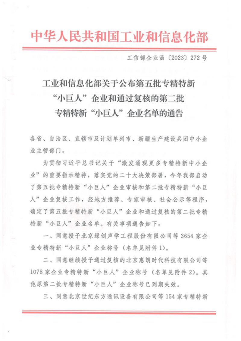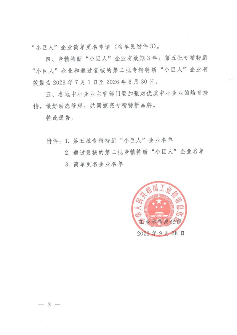 為貫徹習近平總書記關于“激發涌現更多專精特新中小企業”的重要指示精神,落實黨的二十大決策部署,工業和信息化部啟動了第五批專精特新“小巨人”企業審核的工作,我公司榮獲第五批專精特新“小巨人”稱號。